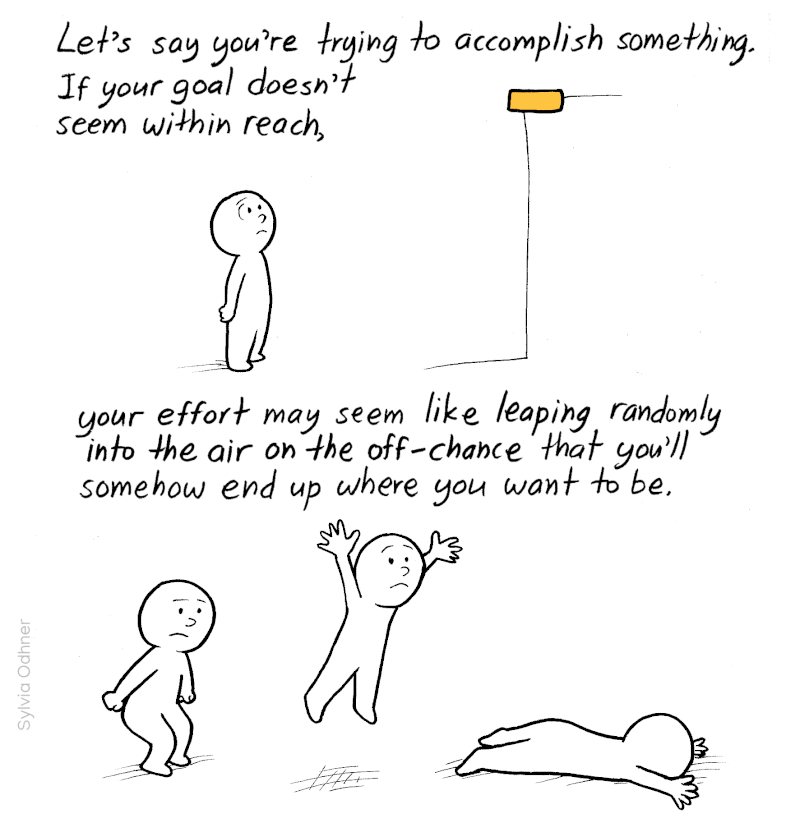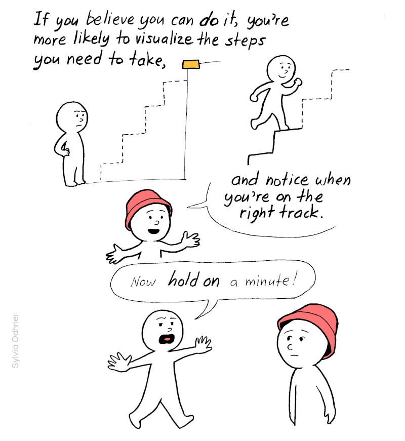 Let's say you're trying to accomplish something. If your goal doesn't seem within reach, your effort may seem like leaping randomly into the air on the off-chance that you'll somehow end up where you want to be. If you believe you can DO it, you're more likely to visualize the steps you need to take, and notice when you're on the right track.