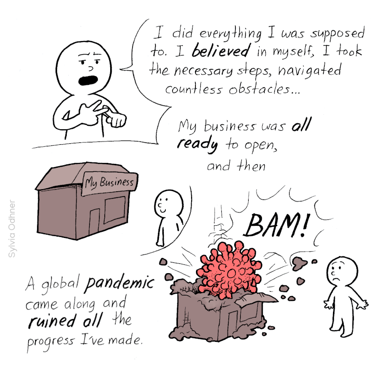 Frustrated person: Now hold on a minute! I did everything I was supposed to. I believed in myself, I took the necessary steps, navigated countless obstacles... My business was all ready to open, and then BAM! A global pandemic came along and ruined all the progress I've made.