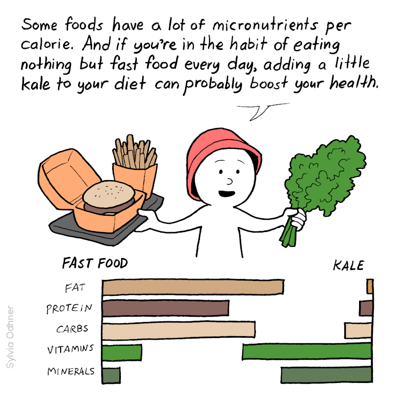 Some foods have a lot of micronutrients per calorie. And if you're in the habit of eating nothing but fast food every day, adding a little kale to your diet can probably boost your health.