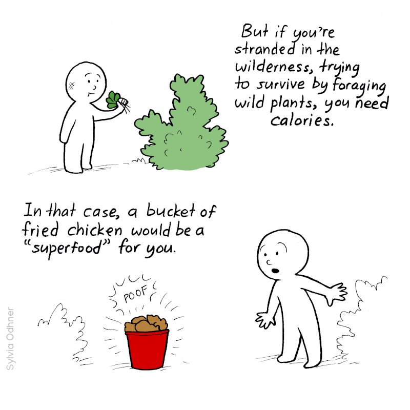 But if you're stranded in the wilderness, trying to survive by foraging wild plants, you need calories. In that case, a bucket of fried chicken would be a “superfood” for you.