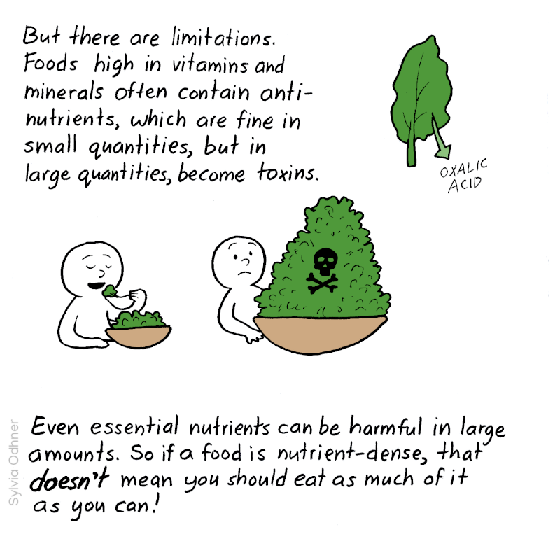 But there are limitations. Foods high in vitamins and minerals often contain anti-nutrients, which are fine in small quantities, but in large quantities, become toxins.Even essential nutrients can be harmful in large amounts. So if a food is nutrient-dense, that doesn't mean you should eat as much of it as you can!