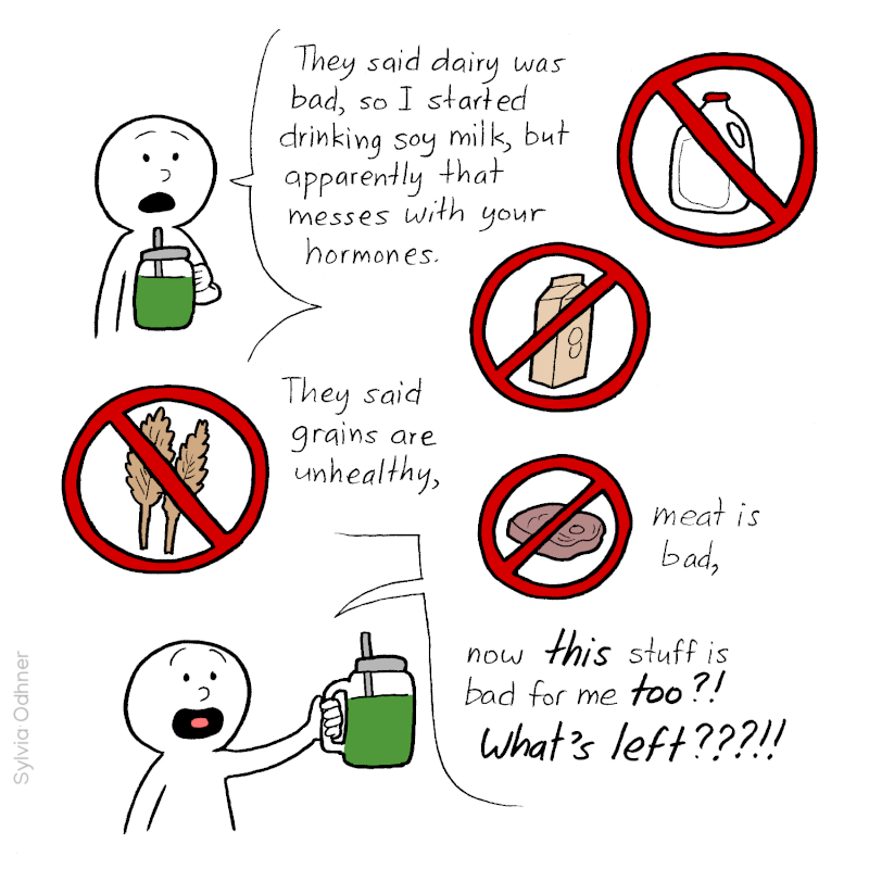 Person: Well, what should I eat then? They said dairy was bad, so I started drinking soy milk, but apparently that messes with your hormones. They said grains are unhealthy, meat is bad, now this stuff is bad for me too?! What's left???!! What's the secret to good health? What's the one pure, perfect food I can base my whole life on?