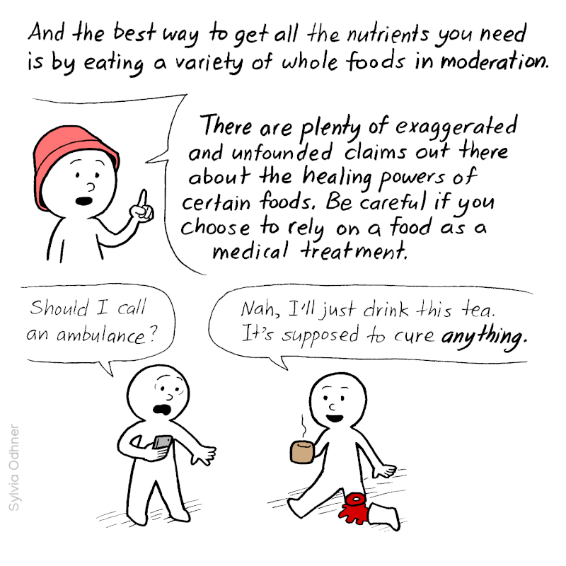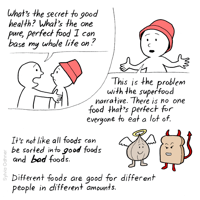 Narrator: This is the problem with the superfood narrative. There is no one food that's perfect for everyone to eat a lot of. It's not like all foods can be sorted into good foods and bad foods. Different foods are good for different people in different amounts. The best way to get all the nutrients you need is by eating a variety of whole foods in moderation.