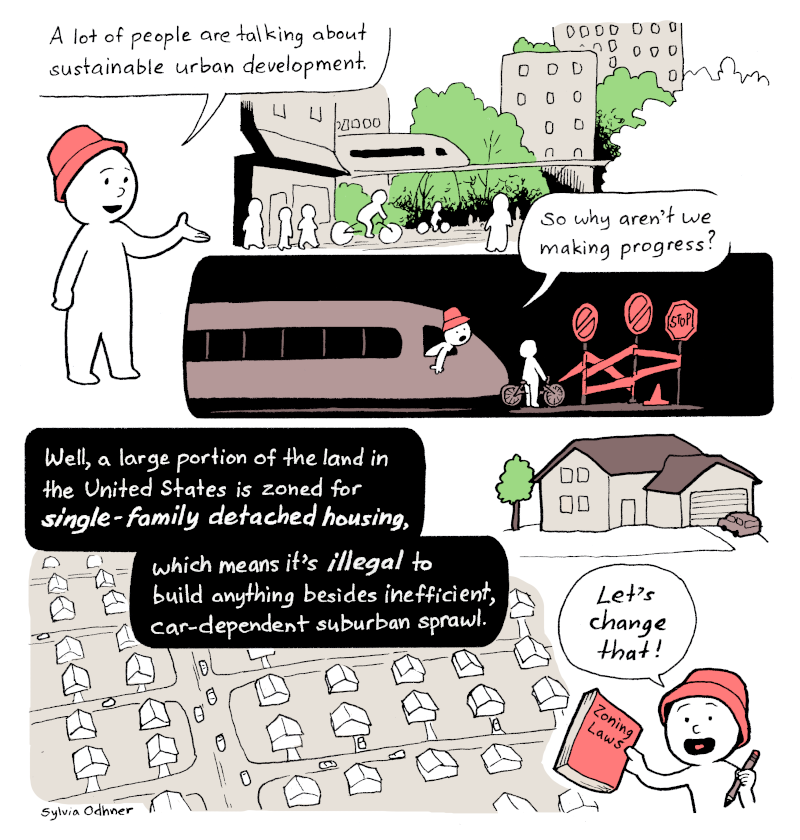 A lot of people are talking about sustainable urban development. So why aren’t we making progress? Well, a large portion of the land in the United States is zoned for single-family detached housing, which means it’s illegal to build anything besides inefficient, car-dependent suburban sprawl. Let’s change that!