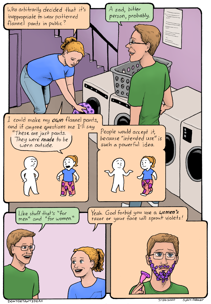 Lily: I could make my OWN flannel pants, and if anyone questions me I'll say "these are just pants. These were MADE to be worn outside." People would accept it, because "intended use" is such a powerful idea.