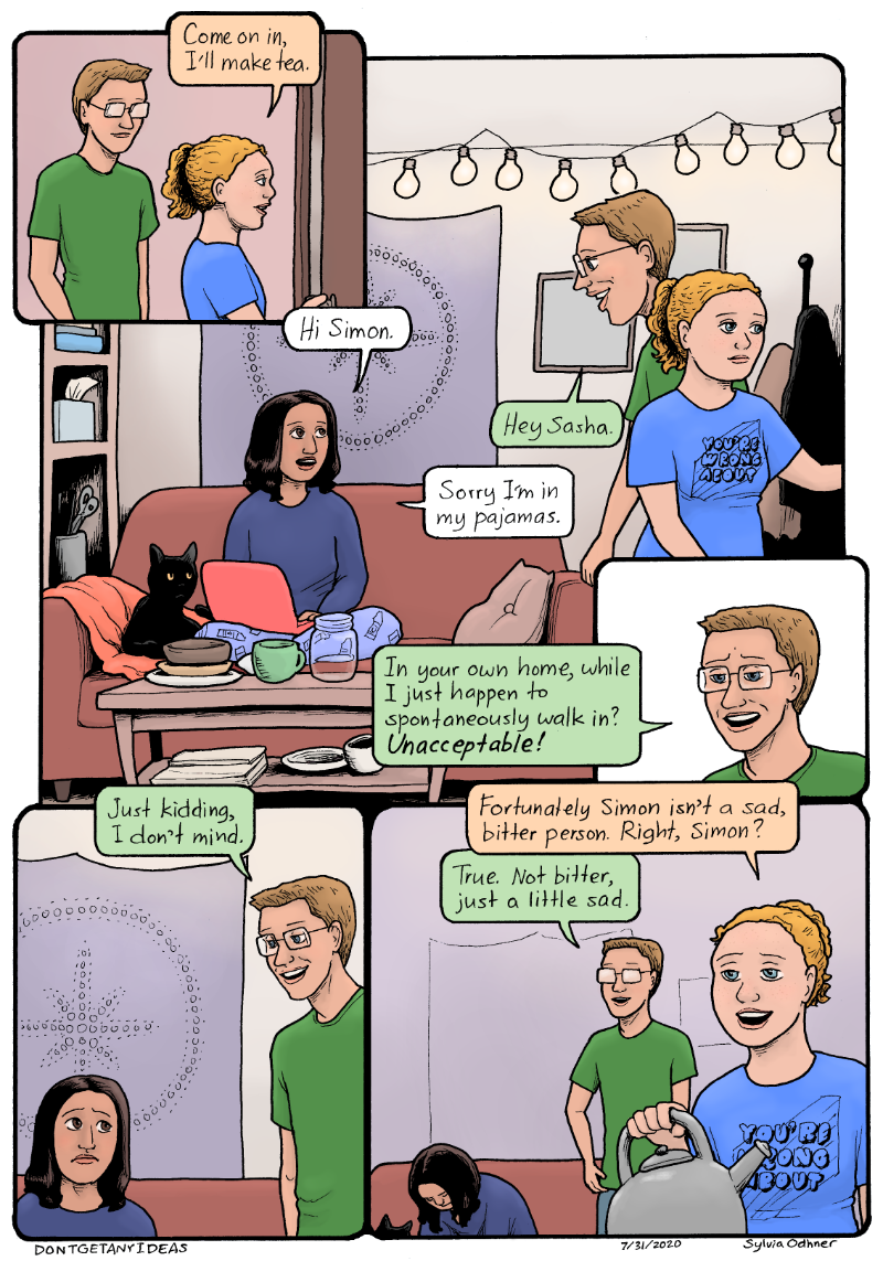 (Lily invites Simon into her apartment, Sasha is on the couch in her pajamas)Lily: Come on in, I'll make tea.