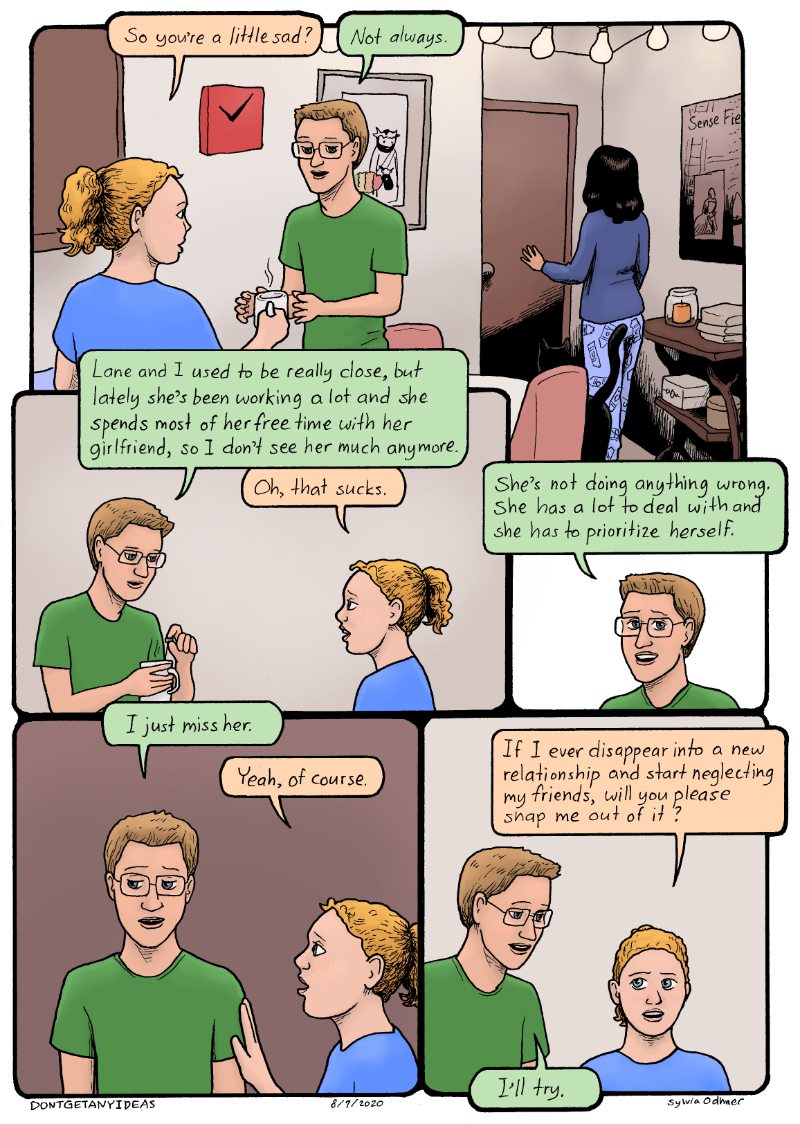 Lily: So you're a little sad?Simon: Not always. Lane and I used to be really close, but lately she's been working a lot and she spends most of her free time with her girlfiend, so I don't see her much anymore. Lily: Oh, that sucks.