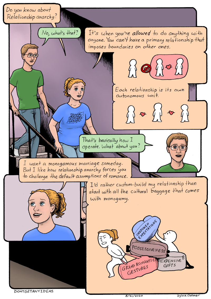 Lily: I want a monogamous marriage someday. But I like how relationship anarchy forces you to challenge the default assumptions of romance. I'd rather custom-build my relationship than start with all the cultural baggage that comes with monogamy.