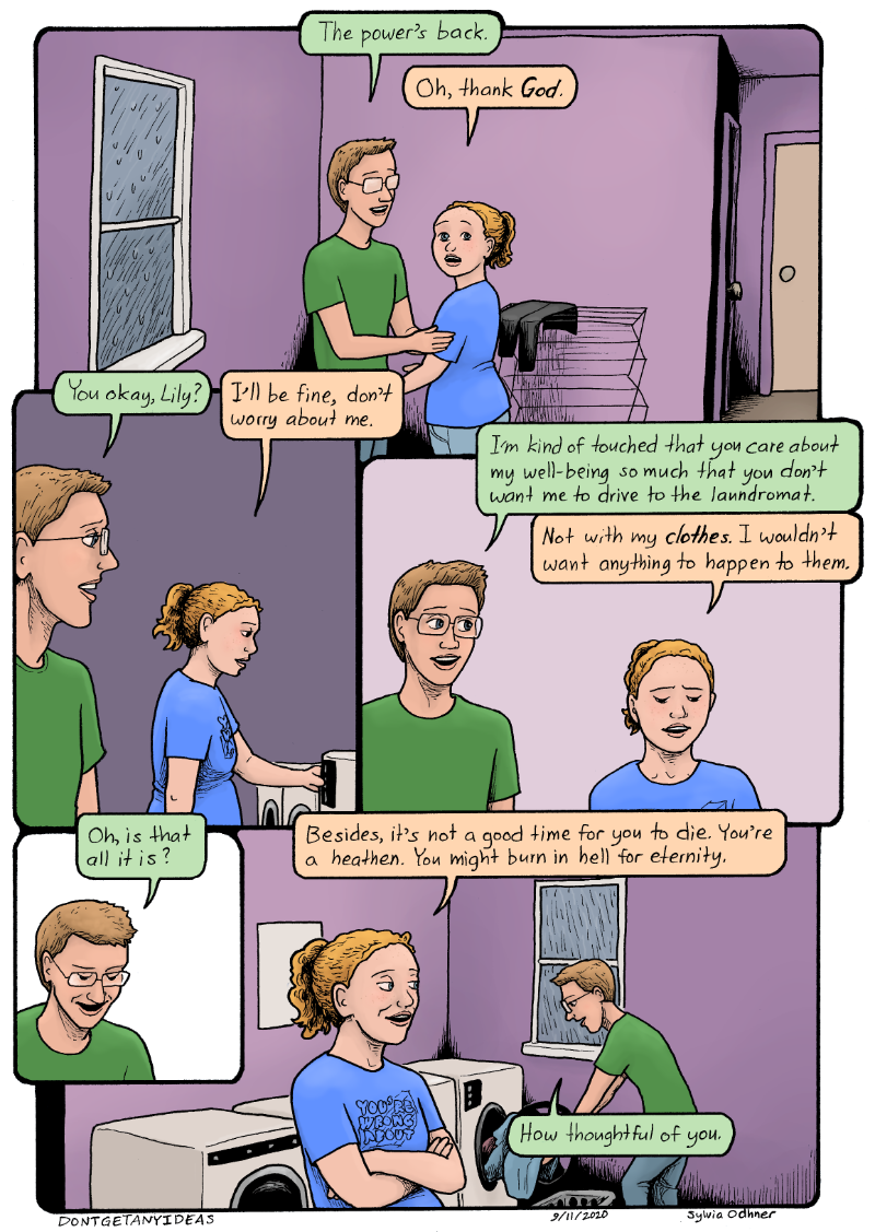 Simon: I'm kind of touched that you care about my well-being so much that you don't want me to drive to the laundromat.