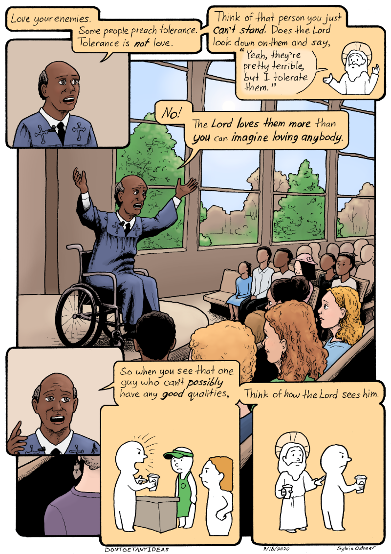 (Lily is in church)Pastor Jones: Love your enemies. Some people preach tolerance. Tolerance is NOT love. Think of that person you just CAN'T STAND. Does the Lord look down on them at say, "yeah, they're pretty terrible, but I tolerate them." NO! The LORD LOVES THEM MORE than YOU can IMAGINE LOVING ANYBODY. So when you see that one guy who can't POSSIBLY have any GOOD qualities, think of how the Lord sees him.