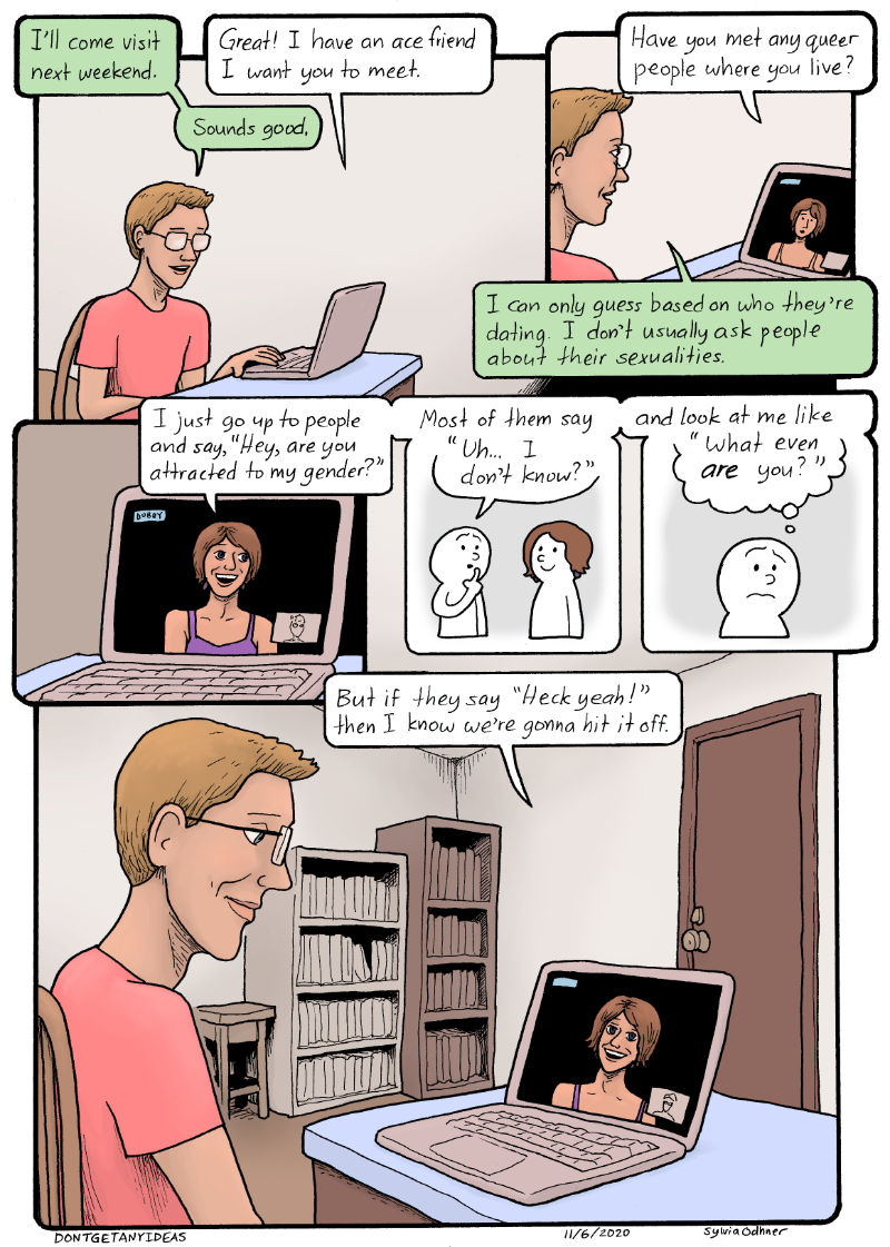 Bobby: I just go up to people and say "Hey, are you attracted to my gender?" Most of them they say "Uh... I don't know?" and look at me like "What even ARE you?" But if they say "Heck yeah!" then I know we're gonna hit it off.