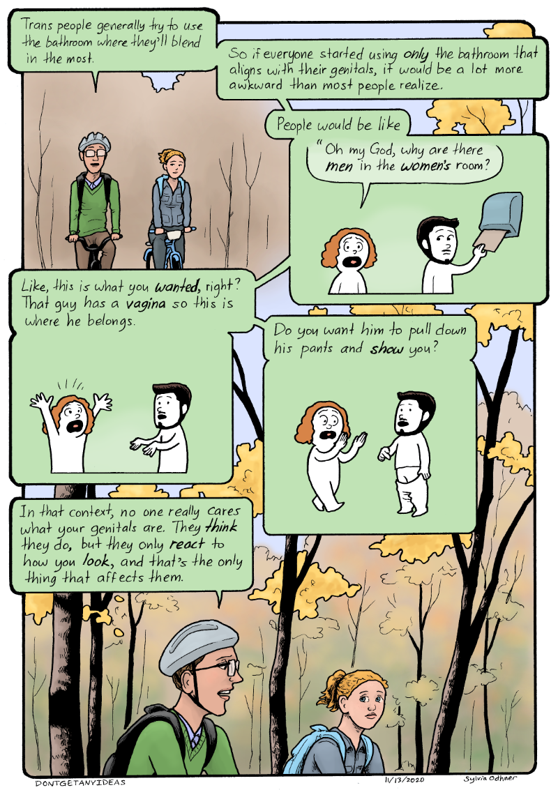 (Simon talks to Lily)Simon: Trans people generally try to use the bathroom where they'll blend in the most. So if everyone suddenly started using ONLY the bathroom that aligns with their genitals, it would be a lot more awkward than most people realize. A lot of trans men LOOK LIKE MEN. People would be like "Oh my God, why are there MEN in the WOMEN'S room?" Like, this is what you WANTED, right? That guy has a VAGINA so this is where he belongs. Do you want him to pull his pants down and SHOW you? In that context, no one really cares what your genitals are. They THINK they do, but they only REACT how you LOOK, and that's the only thing that affects them.