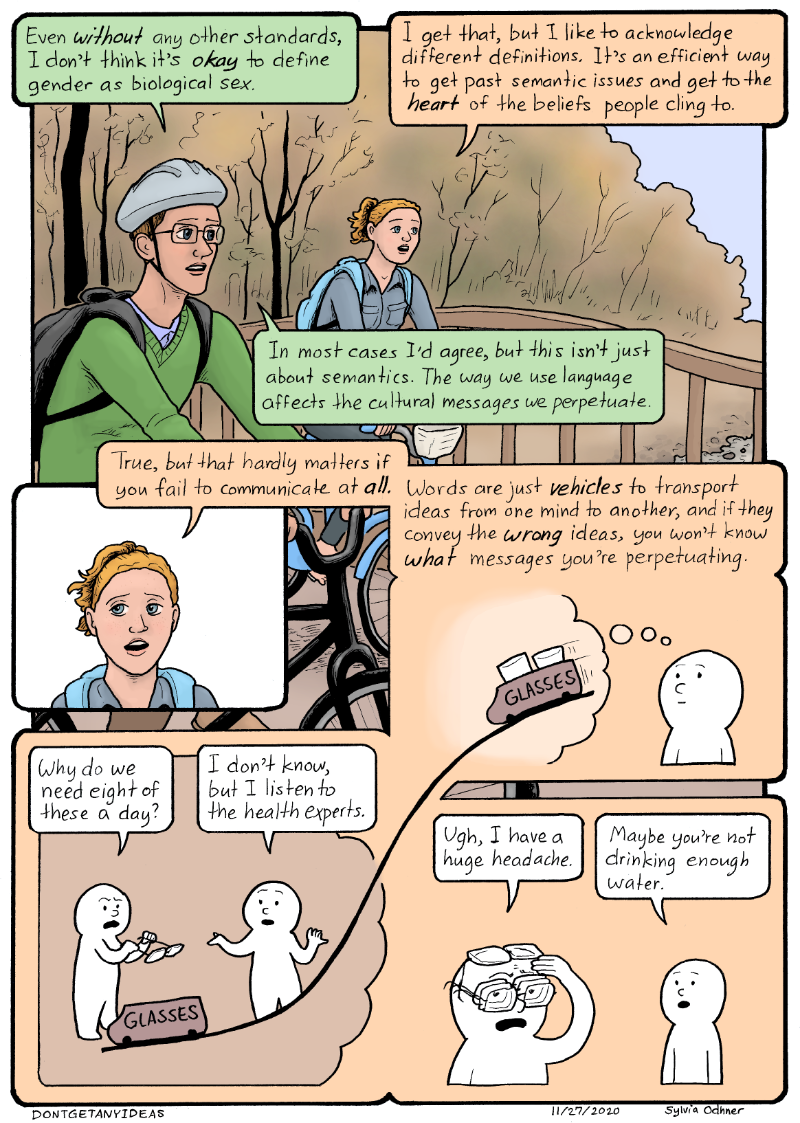 Simon: Even WITHOUT any other standards, I don't think it's OKAY to define gender as biological sex.Lily: I get that, but I like to acknowledge different definitions. It's an efficient way to get past semantic issues and get to the HEART of the beliefs people cling to. Simon: In most cases I'd agree, but this isn't just about semantics. The way we use language affects the cultural messages we perpetuate.