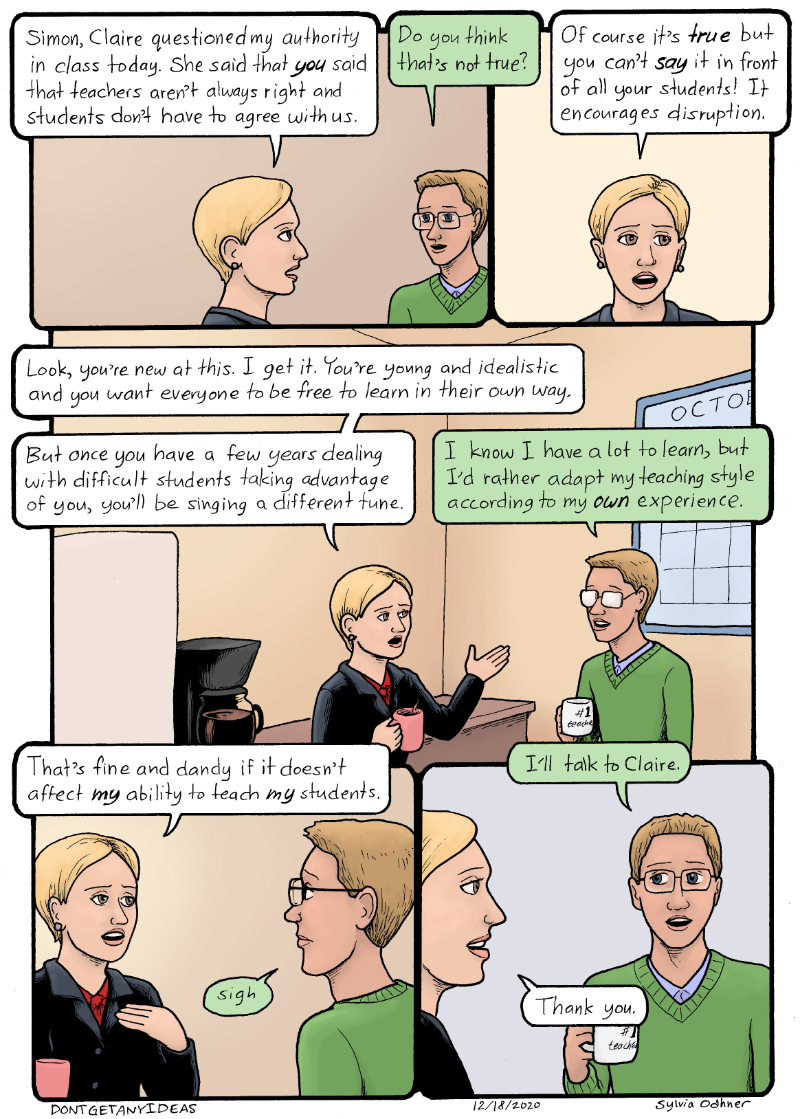 Paige: Simon, Claire questioned my authority in class today. She said that YOU said that teachers aren't always right and students don't have to agree with us.Simon: Do you think that's not true?