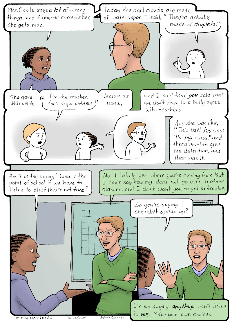 Claire: Mrs. Castle says a LOT of wrong things, and if anyone corrects her, she gets mad. Today she said clouds are made of water vapor. I said "They're actually made of DROPLETS." She gave this whole "I'm the teacher, don't argue with me" lecture as usual, and I said that YOU said that we don't have to blindly agree with teachers. And she was like "This isn't HIS class, it's MY class," and threatened to give me detention, and that was it. Am I in the wrong? What's the point of school if we have to listen to stuff that's not TRUE?Simon: No, I totally get where you're coming from. But I can't say how my ideas will go over in other classes, and I don't want you to get in trouble.