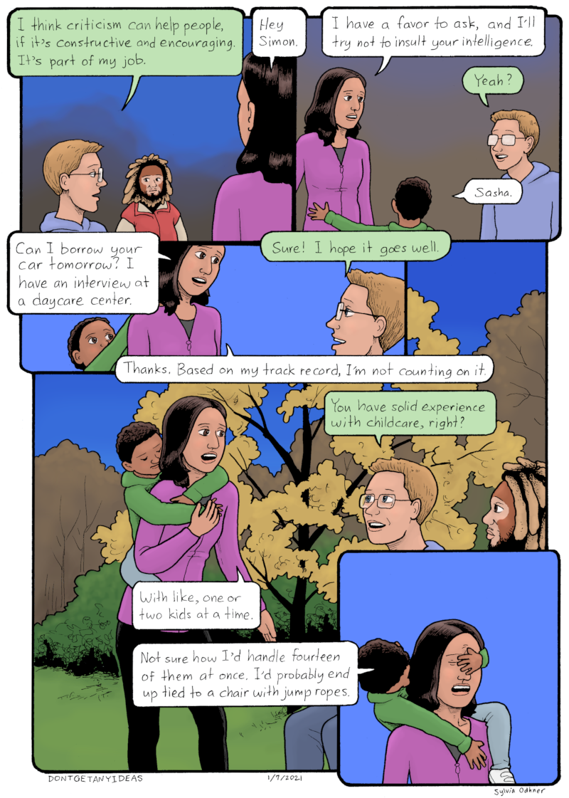 Sasha: Can I borrow your car tomorrow? I have an interview at a daycare center.