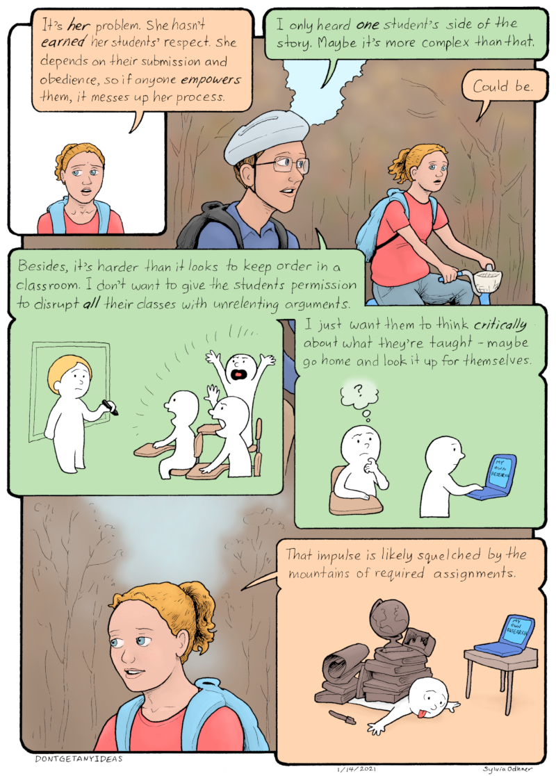 Lily: It's HER problem. She hasn't EARNED her students' respect. She depends on their submission and obedience, so if anyone EMPOWERS them, it messes up her process.Simon: I only heard ONE student's side of the story. Maybe it's more complex than that.