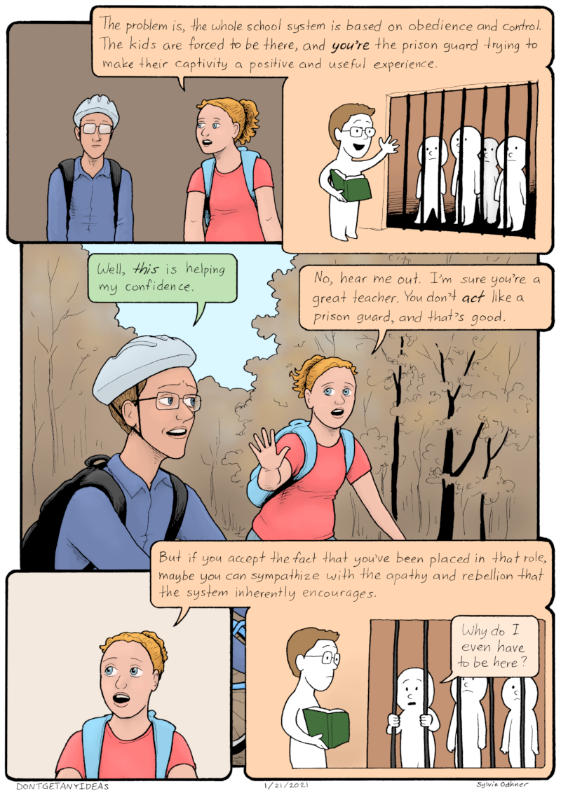 Lily: The problem is, the whole school system is based on obedience and control. The kids are forced to be there, and YOU'RE the prison guard trying to make their captivity a positive and useful experience.(panel with Simon teaching people in a prison cell)
