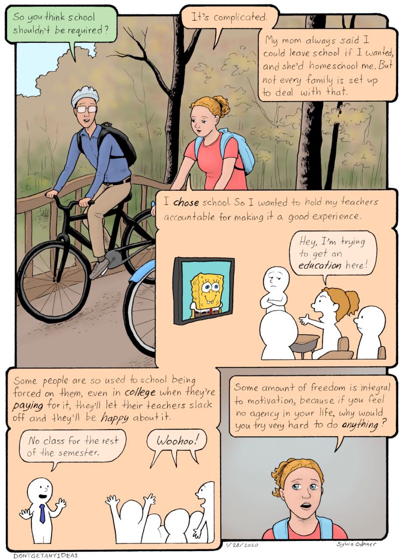 Simon: So you think school shouldn't be required?Lily: It's complicated. My mom always said I could leave school if I wanted, and she'd homeschool me. But not every family is set up to deal with that. I CHOSE school. So I wanted to hold my teachers accountable for making it a good experience.