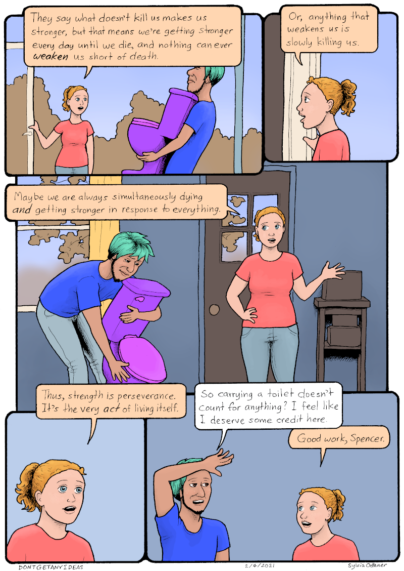 (Spencer is carrying a toilet into his house)Lily: They say what doesn't kill us makes us stronger, but that means we're getting stronger every day until we die, and nothing can ever WEAKEN us short of death. Or, anything that weakens us is slowly killing us. Maybe we are always simultaneously dying AND getting stronger in response to everything. Thus, strength is perseverance ? it's the very ACT of living itself.