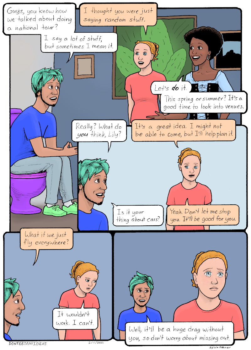 Spencer: Guys, you know how we talked about doing a national tour? Lily: I thought you were just saying random stuff. Spencer. I say a lot of stuff, but sometimes I mean it. Angie: Let's DO it. This spring or summer? It's a good time to look into venues. Spencer: Really? What do YOU think, Lily? Lily: It's a great idea. I might not be able to come, but I?ll help plan it. Spencer: Is it your thing about cars? Lily: Yeah. Don't let me stop you. It?ll be good for you. Spencer: What if we just fly everywhere? Lily: It wouldn?t work. I can?t. Spencer: Well, it'll be a huge drag without you, so don't worry about missing out. (Lily looks away and she has tears in her eyes)Moving Death Traps