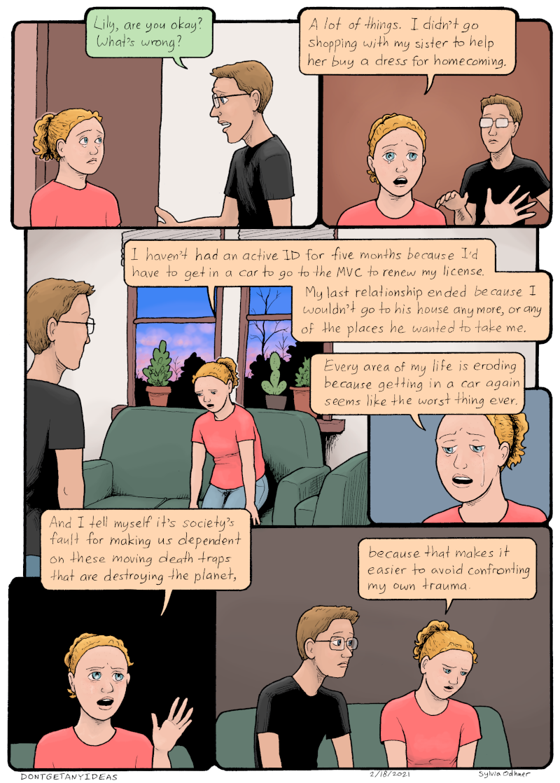 (Lily shows up at Simon's apartment crying) Simon: Lily, are you okay? What's wrong? Lily: A lot of things. I didn't go shopping with my sister to help her buy a dress for homecoming. I haven't had an active ID for five months because I'd have to get in a car to get to the MVC to renew my license. My last relationship ended because I wouldn't go to his house anymore, or any of the places he wanted to take me. Every area of my life is eroding because getting in a car again seems like the worst thing ever. And I tell myself it's society's fault for making us dependent on these moving death traps that are destroying the planet, because that makes it easier to avoid confronting my own trauma.A Hard Thing