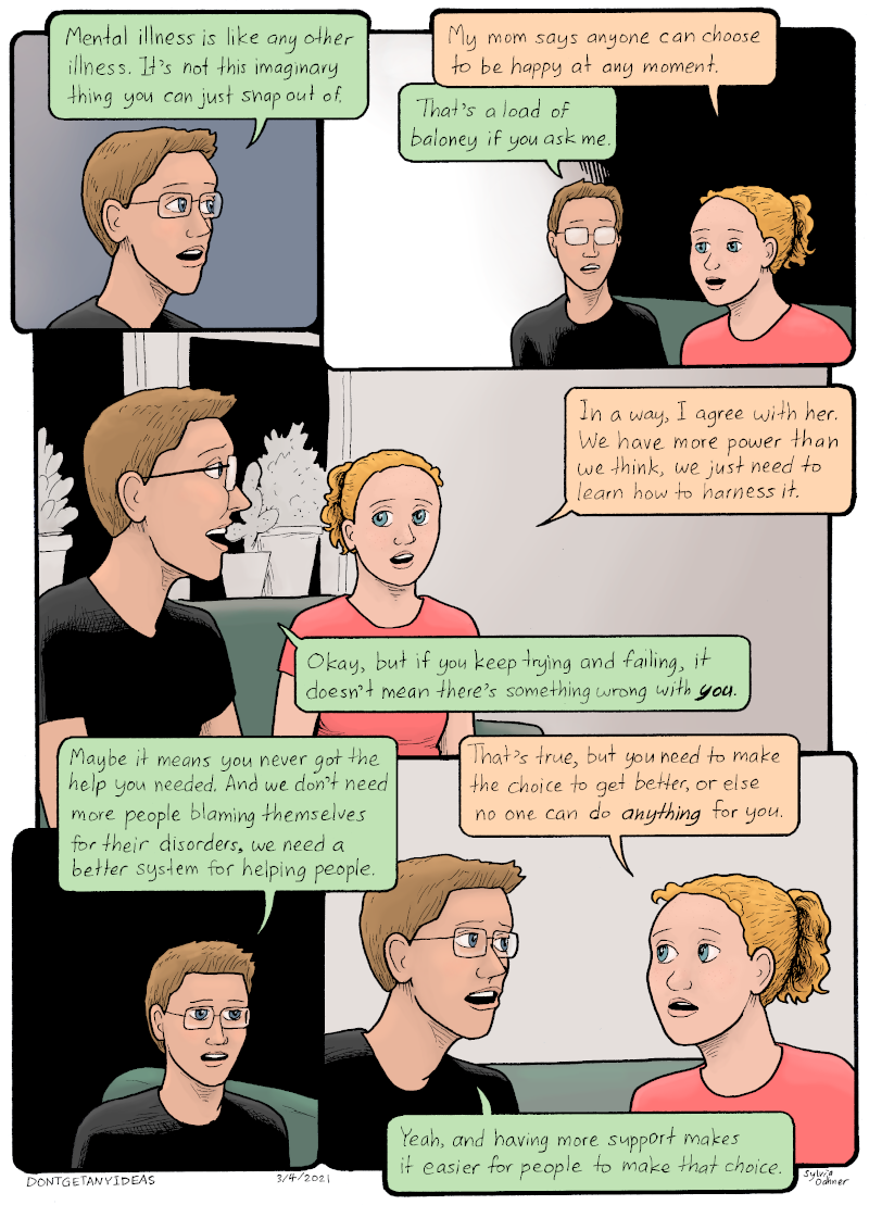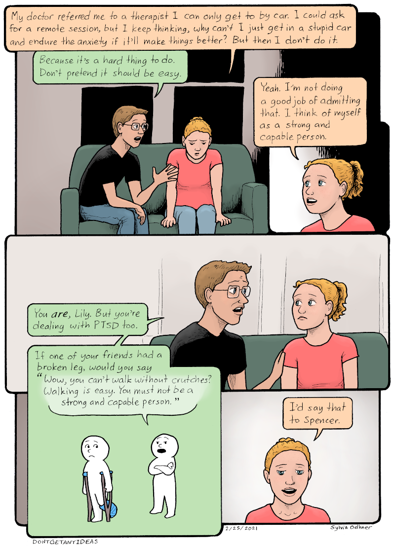 Lily: My doctor referred me to a therapist I can only get to by car. I could ask for a remote session, but I keep thinking, why can't I just get in a stupid car and endure the anxiety if it'll make things better? But then I don't do it. Simon: Because it's a hard thing to do. Don't pretend it should be easy. Lily: Yeah. I'm not doing a good job of admitting that. I think of myself as a strong and capable person. Simon: You ARE, Lily. But you're dealing with PTSD too. If one of your friends had a broken leg, would you say "Wow, you can't walk without crutches? Walking is easy. You must not be a strong and capable person." Lily: I'd say that to Spencer.Choosing Happiness