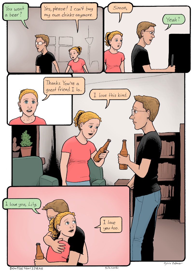 Simon: You want a beer? Lily: Yes, please! I can't buy my own drinks anymore. Simon, Simon: Yeah? Lily: Thanks. You're a great friend. I lo... (Lily looks at the beer) Lily: I love this kind. (Simon hugs Lily) Simon: I love you, Lily. Lily: I love you too.<< first < previous next > latest >>