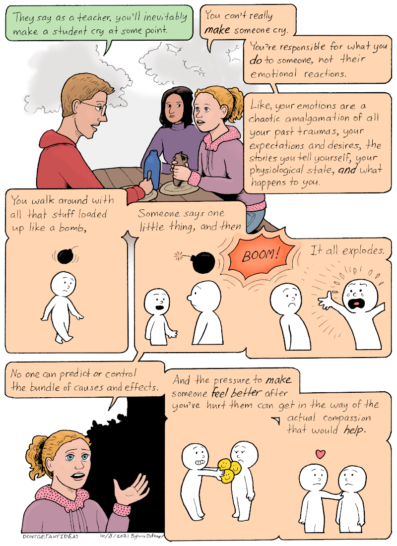 Simon: They say as a teacher, you'll inevitably make a student cry at some point.Lily: You can't really MAKE someone cry. You're responsible for what you DO to someone, not their emotional reactions. Like, your emotions are a chaotic amalgamation of all your past traumas, your expectations and desires, the stories you tell yourself, your physiological state, AND what happens to you. You walk around with all that stuff loaded up like a bomb, someone says one little thing, and then BOOM! It all explodes. No one can predict or control the bundle of causes and effects. And the pressure to MAKE someone FEEL BETTER after you've hurt them can get in the way of the actual compassion that would HELP.
