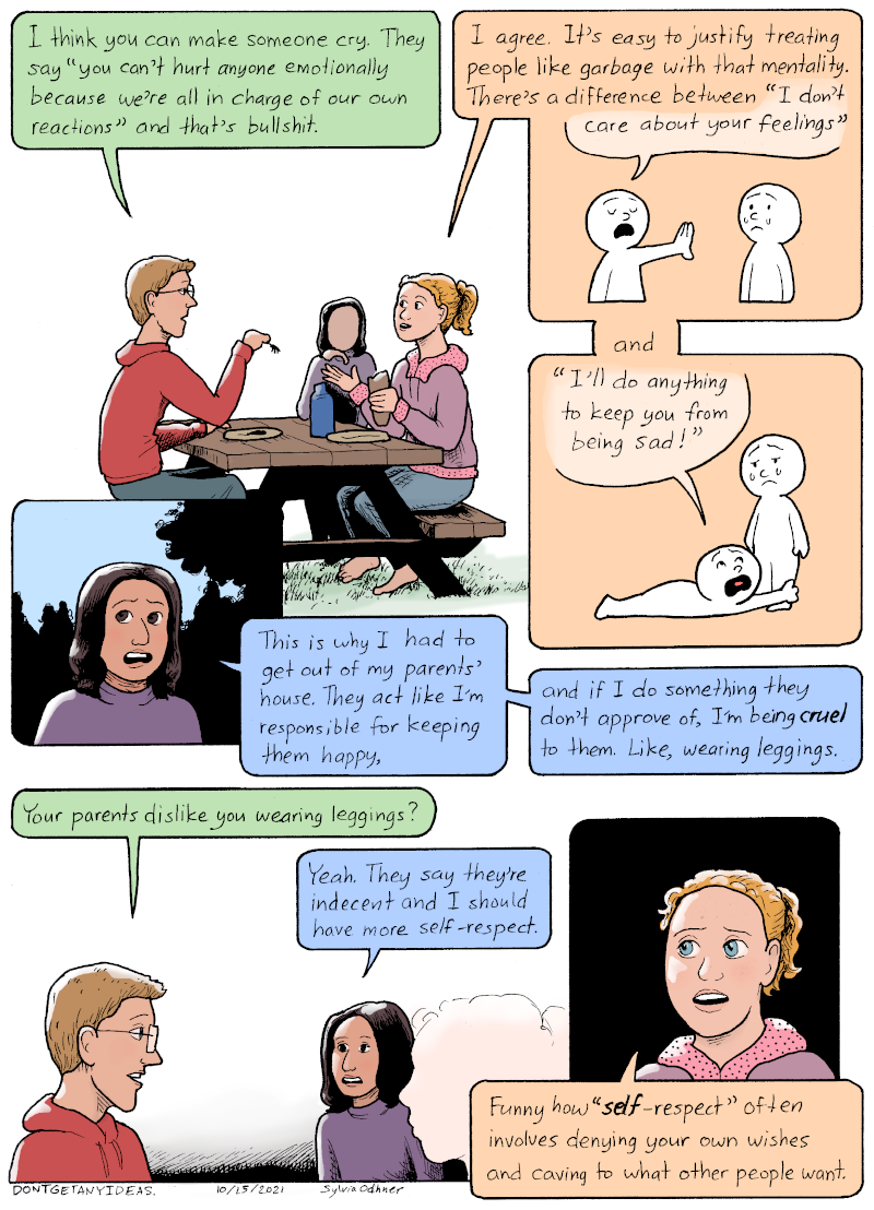 Sasha: This is why I had to get out of my parents' house. They act like I’m responsible for keeping them happy, and if I do something they don't approve of, I'm being CRUEL to them. Like... wearing leggings.