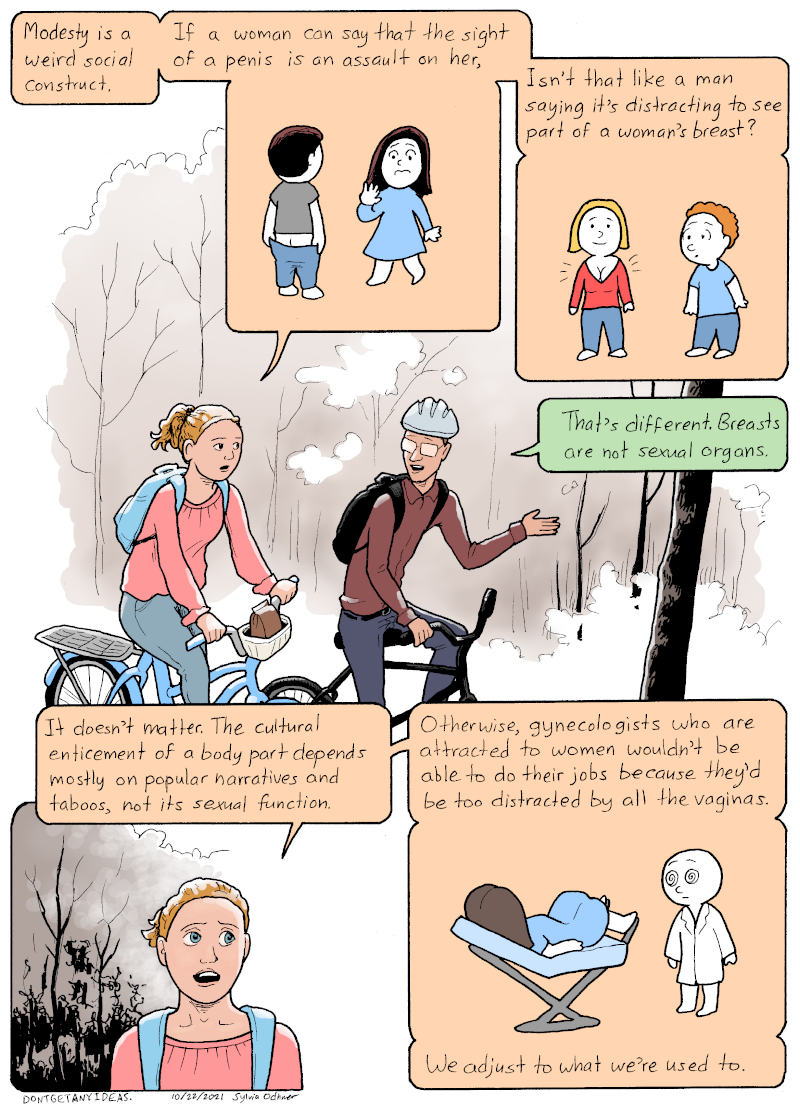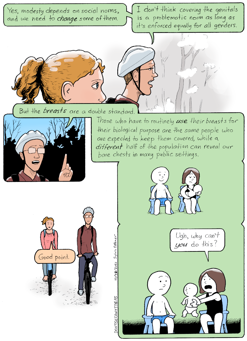 Simon: Yes, modesty depends on social norms, and we need to CHANGE some of them. I don't think covering the genitals is a problematic norm as long as it's enforced equally for all genders. But the BREASTS are a double standard. Those who have to routinely USE their breasts for their biological purpose are the same people who are expected to keep them covered, while a DIFFERENT half of the population can reveal our bare chests in many public settings.Lily: Good point.