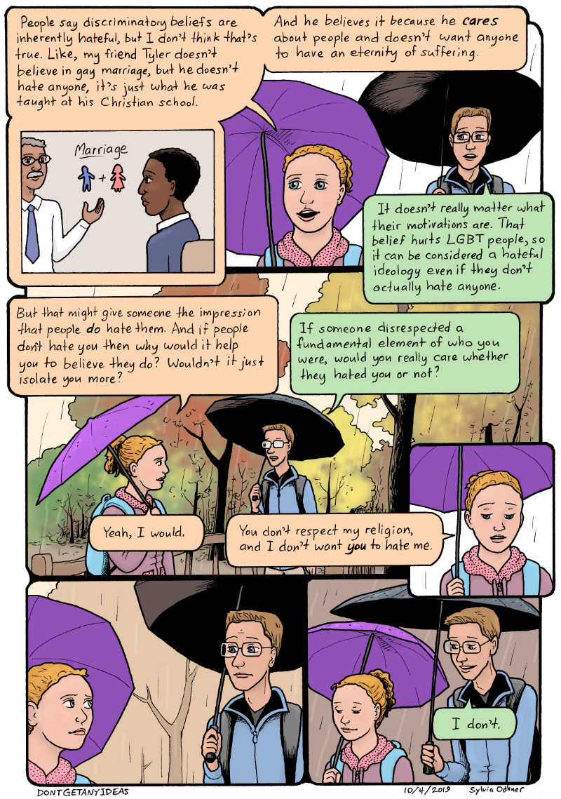 Lily: People say discrinimatory beliefs are inherently hateful, but I don't think that's true. Like, my friend Tyler doesn't believe in gay marriage, but he doesn't hate anyone, it's just what he was taught at his Christian school. And he believes it because he CARES about people and doesn't want anyone to have an eternity of suffering.