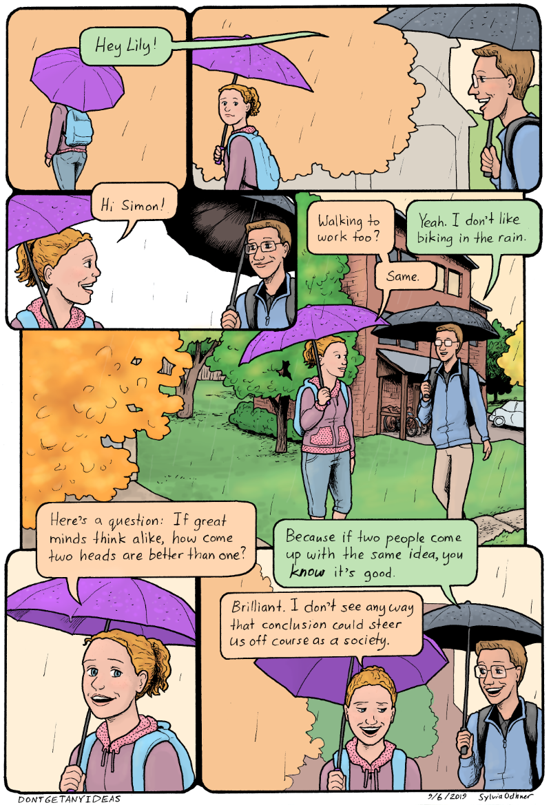Lily: Same. Here's a question: If great minds think alike, how come two heads are better than one?