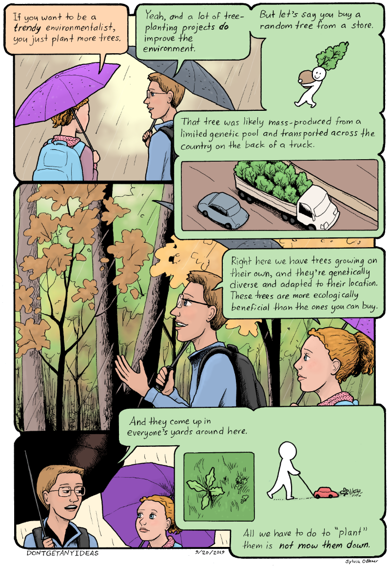 Simon: Yeah, and a lot of tree-planting projects DO improve the environment. But let's say you buy a random tree from a store. That tree was likely mass-produced from a limited genetic pool and transported across the country in the back of a truck. Right here we have trees growing on their own, and they're genetically diverse and adapted to their location. These trees are more ecologically beneficial than the ones you can buy. And they come up in everyone's yards around here. All we have to do to "PLANT" them is NOT MOW THEM DOWN.