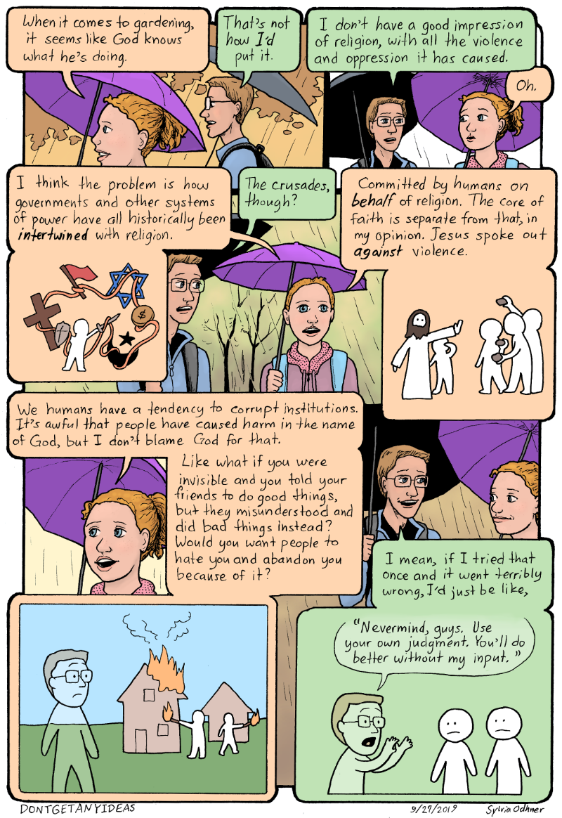 Lily: Committed by humans oh BEHALF of religion. The core of faith is separate from that, in my mind. Jesus spoke out AGAINST violence. We humans have a tendency to corrupt institutions. It's awful that people have caused harm in the name of God, but I don't blame God for that. Like what if you were invisible and you told your friends to do good things, but they misunderstood and did bad things instead? Would you want people to hate you and abandon you because of it?