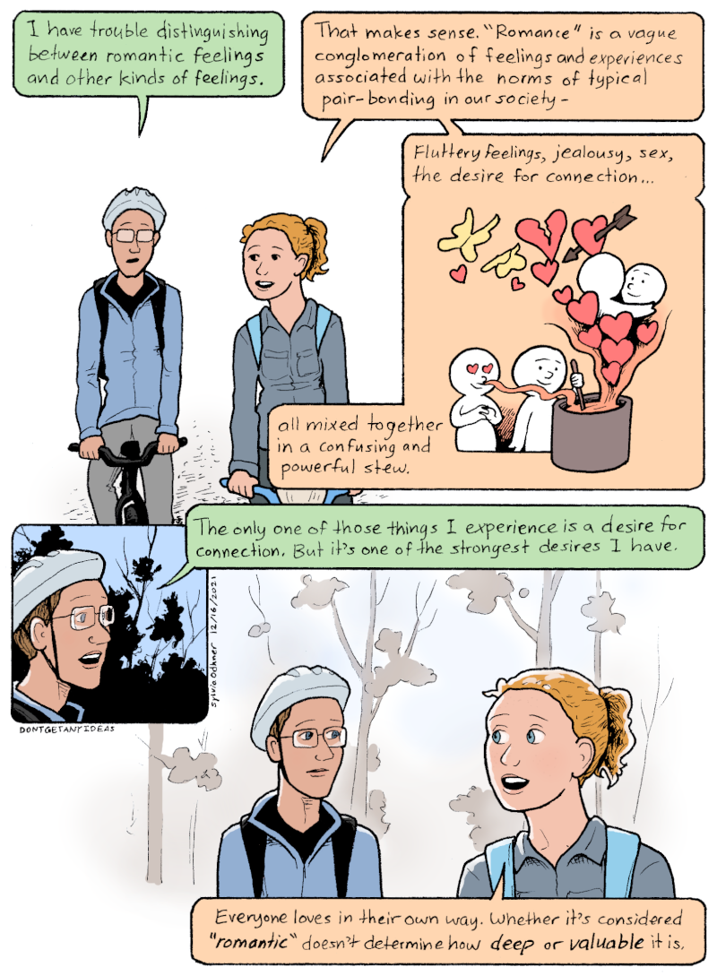 Simon: I have trouble distinguishing between romantic feelings and other kinds of feelings.Lily: That makes sense. "Romance" is a vague conglomeration of feelings and experiences associated with the norms of typical pair-bonding in our society - fluttery feelings, jealousy, sex, the desire for connection... all mixed together in a confusing and powerful stew.