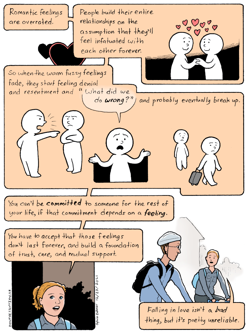 Lily: Romantic feelings are overrated. People build their entire relationships on the assumption that they'll feel infatuated with each other forever. So when the warm fuzzy feelings fade, they start feeling denial and resentment and "what did we do wrong?" and probably eventually break up. You can't be COMMITTED to someone for the rest of your life, if that commitment depends on a FEELING. You have to accept that those feelings don't last forever, and build a foundation of trust, care, and mutual support. Falling in love isn't a BAD thing, but it's pretty unreliable.Breaking Up