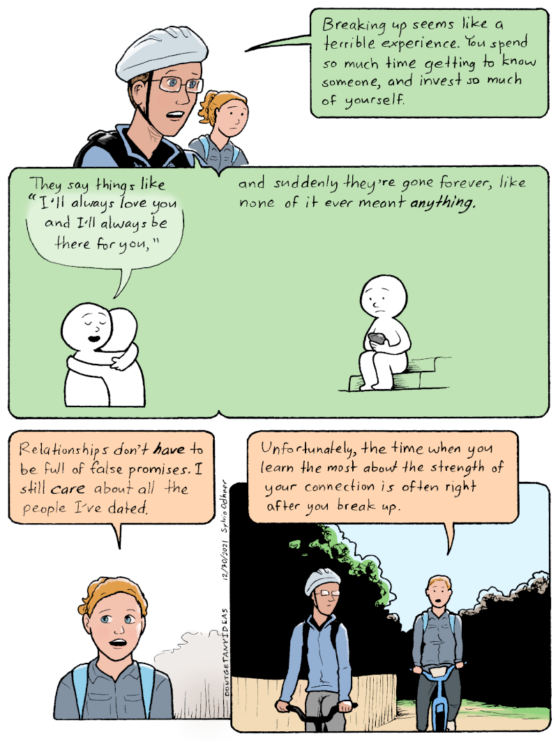 Simon: Breaking up seems like a terrible experience. You spend so much time getting to know someone, and invest so much of yourself. They say things like "I'll always love you and I'll always be there for you," and suddenly they're gone forever, like none of it ever meant ANYTHING.Lily: Relationships don't HAVE to be full of false promises. I still CARE about all the people I've dated. Unfortunately, the time when you learn the most about the strength of your connection is often right after you break up.