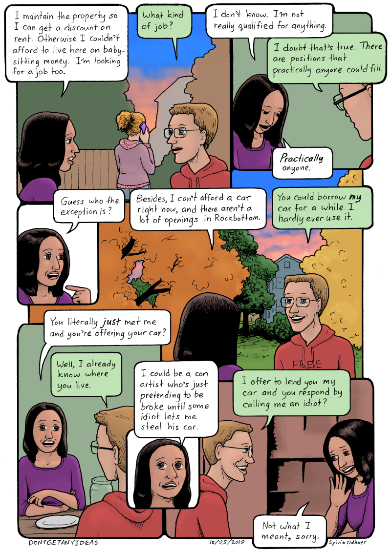 Sasha: I could be a con artist who's just pretending to be broke until some idiot lets me steal his car.