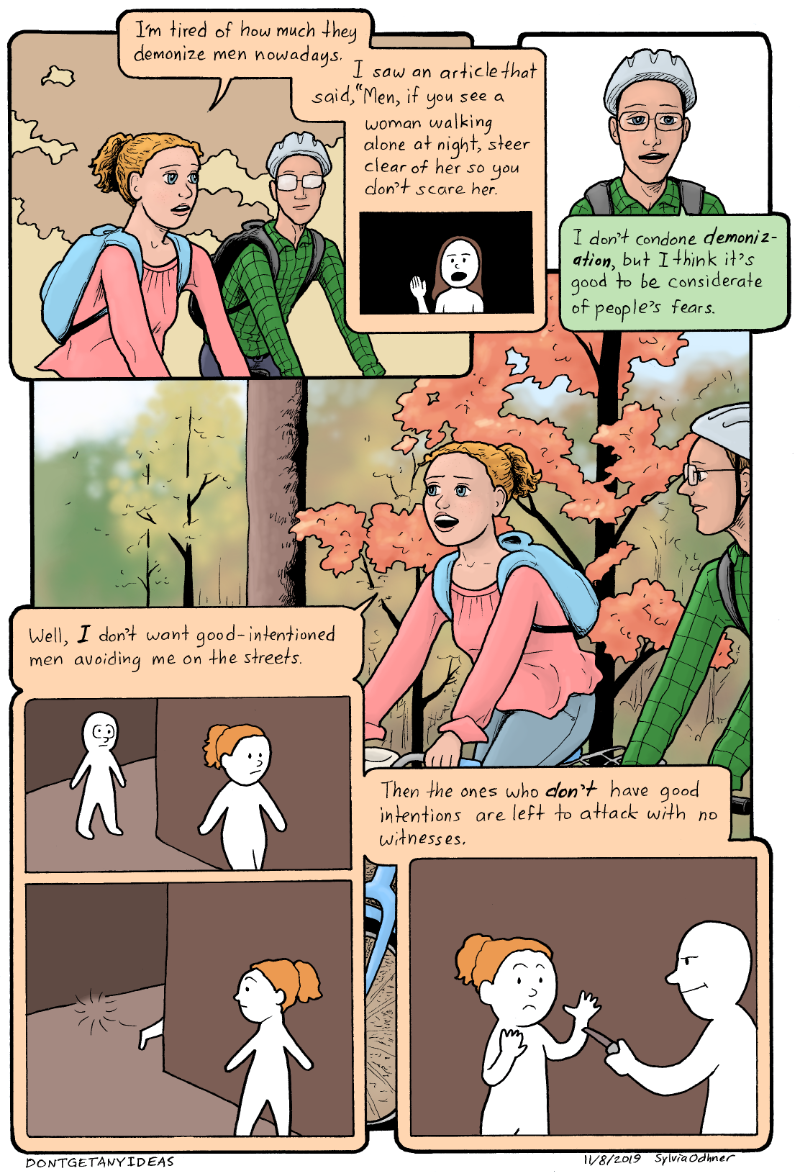 Lily: I'm tired of how much they demonize men nowadays. I saw an article that said, "Men, if you see a woman walking alone at night, steer clear of her so you don't scare her."Simon: I don't condone DEMONIZATION, but I think it's good to be considerate of people's fears.