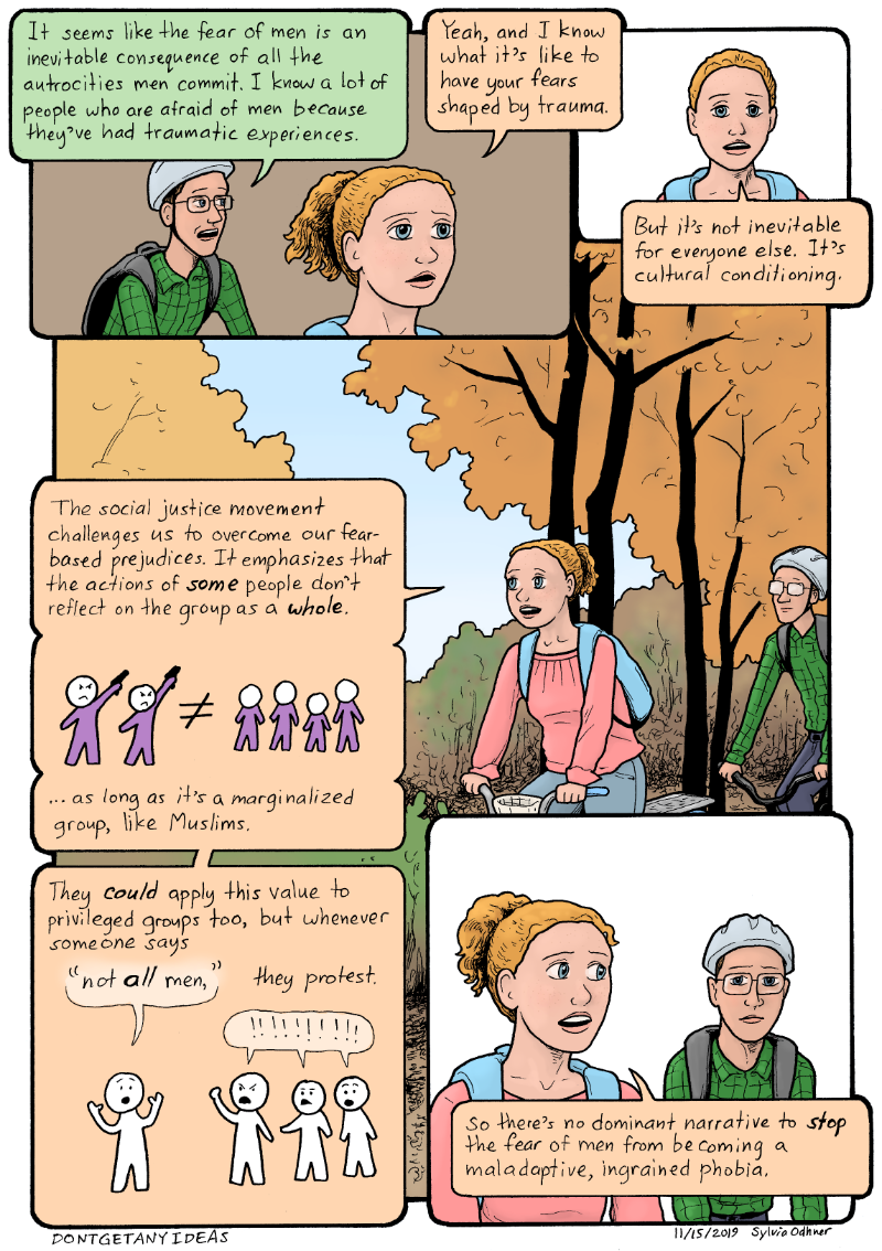 Simon: It seems like the fear of men is an inevitable consequence of all the autrocities men commit. I know a lot of people who are afraid of men because they've had traumatic experiences.Lily: Yeah, and I know what it's like to have your fears shaped by trauma. But it's not inevitable for everyone else. It's cultural conditioning. The social justice movement challenges us to overcome our fear-based prejudices. It emphasizes that the actions of SOME people don't reflect on the group as a WHOLE. ...as long as it's a marginalized group, like Muslims. They COULD apply this value to privileged groups too, but whenever someone says ?not ALL men,? they protest. So there's no dominant narrative to STOP the fear of men from becoming a maladaptive, ingrained phobia.