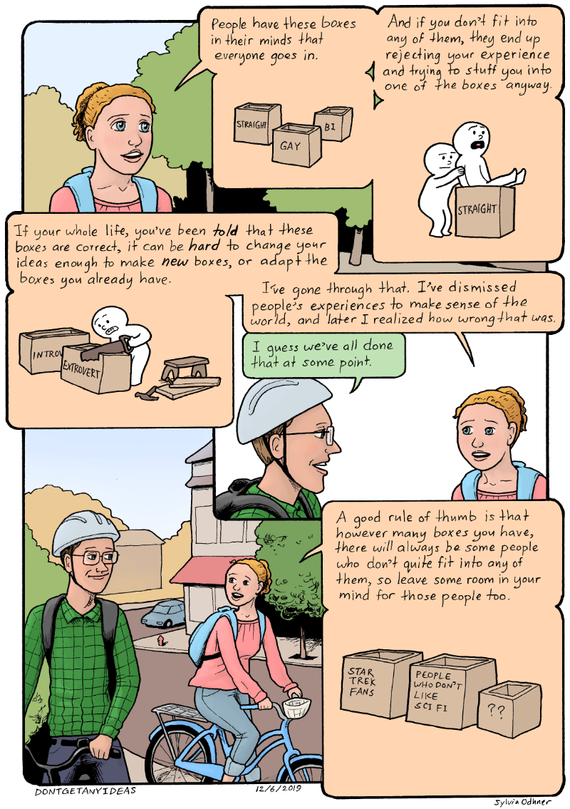 Lily: If your whole life, you've been TOLD that these boxes are correct, it can be HARD to change your ideas enough to make NEW boxes, or adapt the boxes you already have.I've gone through that. I've dismissed people's experiences to make sense of the world, and later I realized how wrong that was.