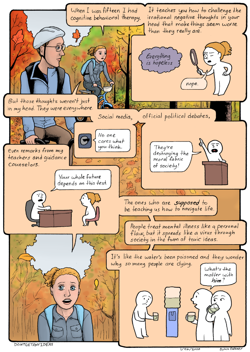 Lily: People treat mental illness like a personal flaw, but it spreads like a virus through society in the form of toxic ideas. It's like the water's been poisoned and they wonder why so many people are dying.