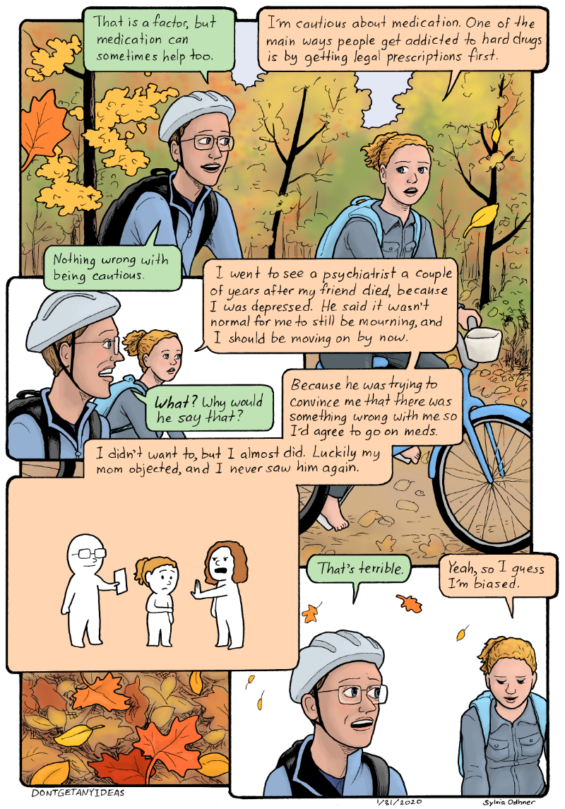 Simon: That is a factor, but medication can sometimes help too.Lily: I'm cautious about medication. One of the main ways people get addicted to hard drugs is by getting legal prescriptions first.