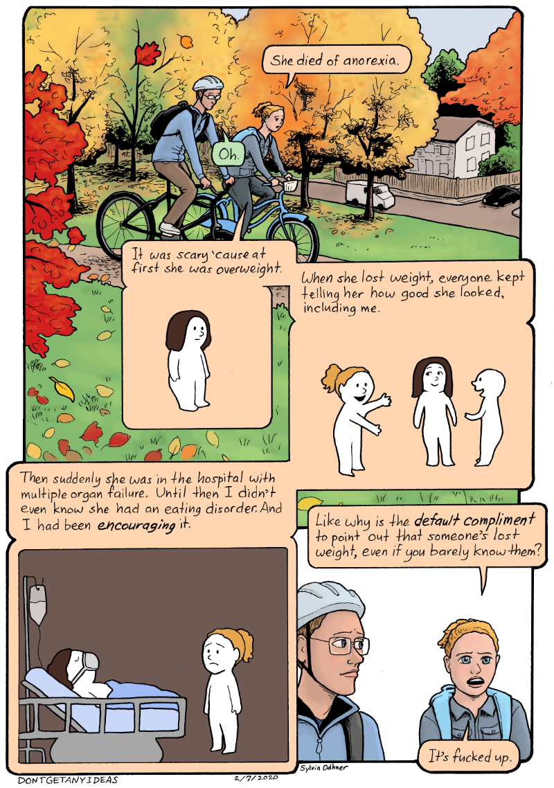 Lily: It was scary 'cause at first she was overweight. When she lost weight, everyone kept telling her how good she looked, including me. Then suddenly she was in the hospital with multiple organ failure. Until then I didn't even know she had an eating disorder. And I had been ENCOURAGING it. Like why is the DEFAULT COMPLIMENT to point out that someone's lost weight, even if you barely know them? It's fucked up.