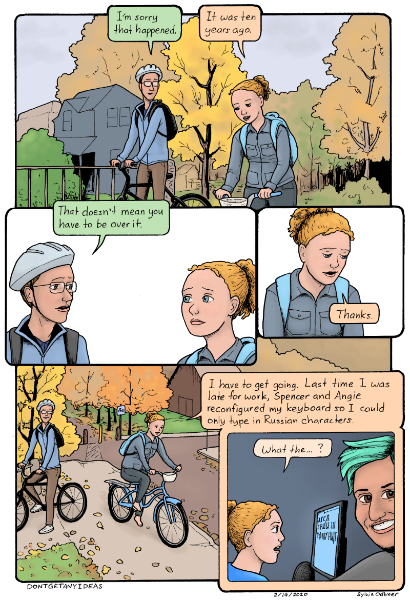 Lily: Thanks. I have to get going. Last time I was late for work, Spencer and Angie reconfigured my keyboard so I could only type in Russian characters.