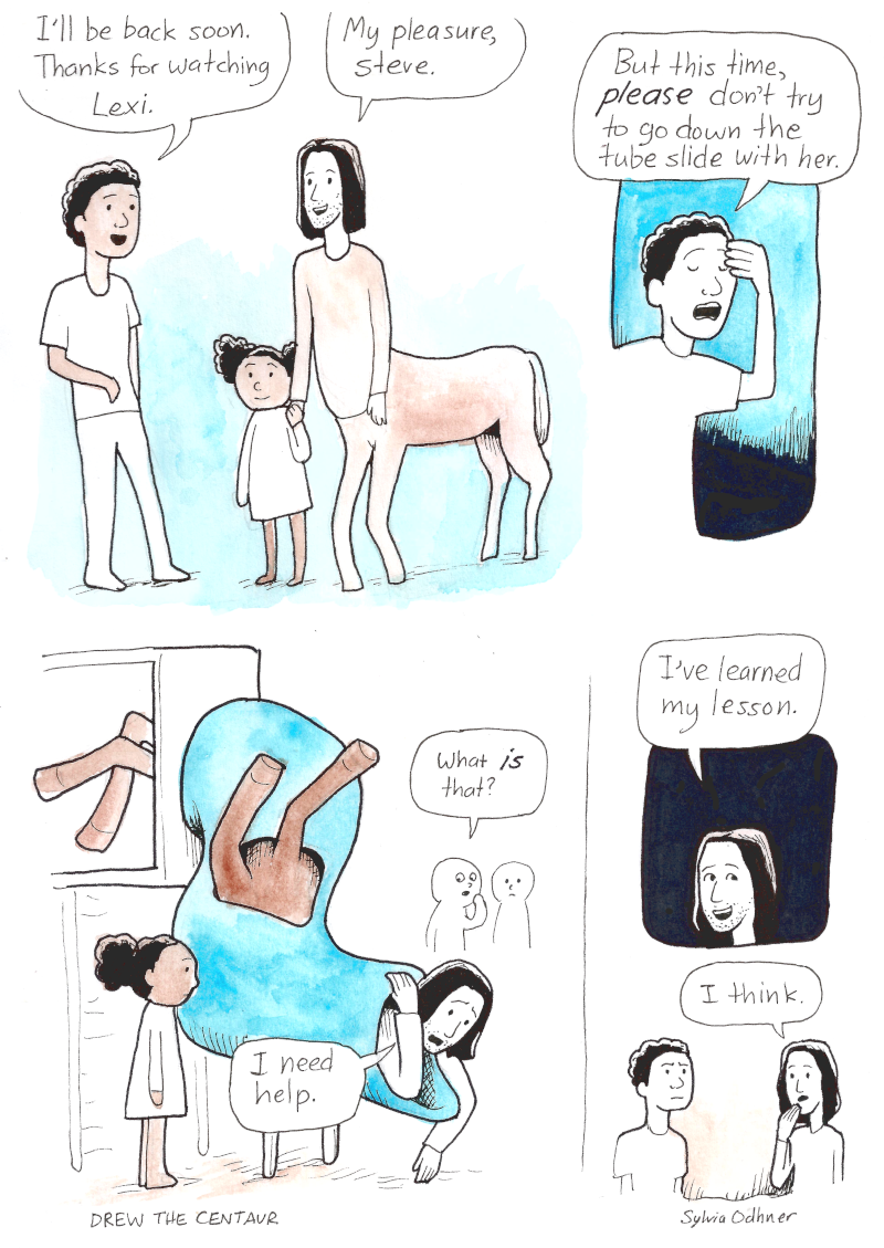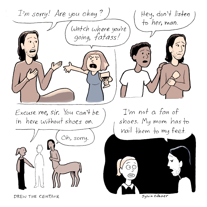 Drew the centaur: Yeah, sorry. I tried wearing pants one day and it was too hard to get them down to pee.