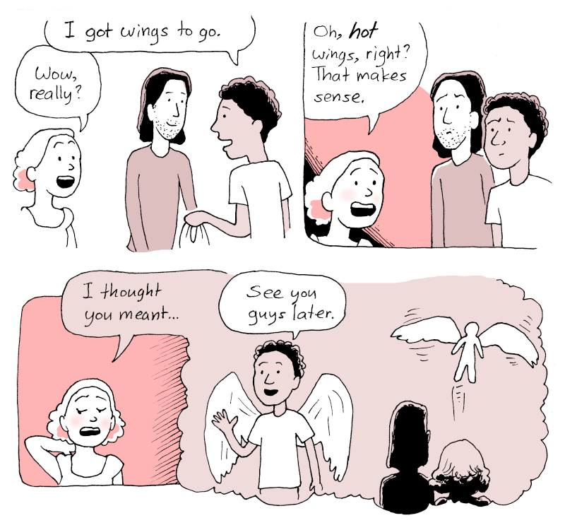 Olive: Oh, HOT wings, right? That makes sense. I thought you meant...