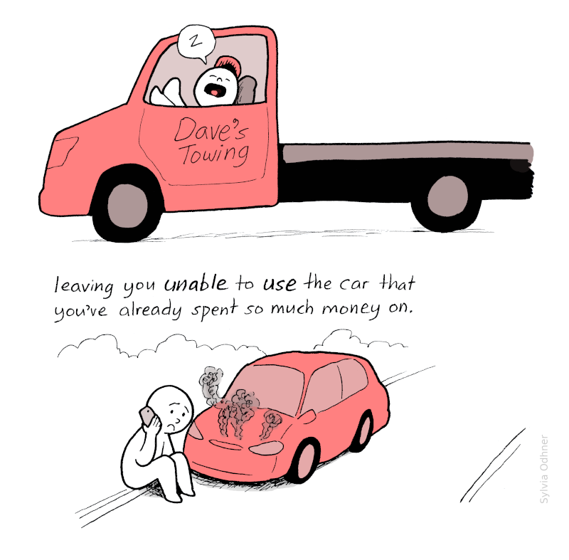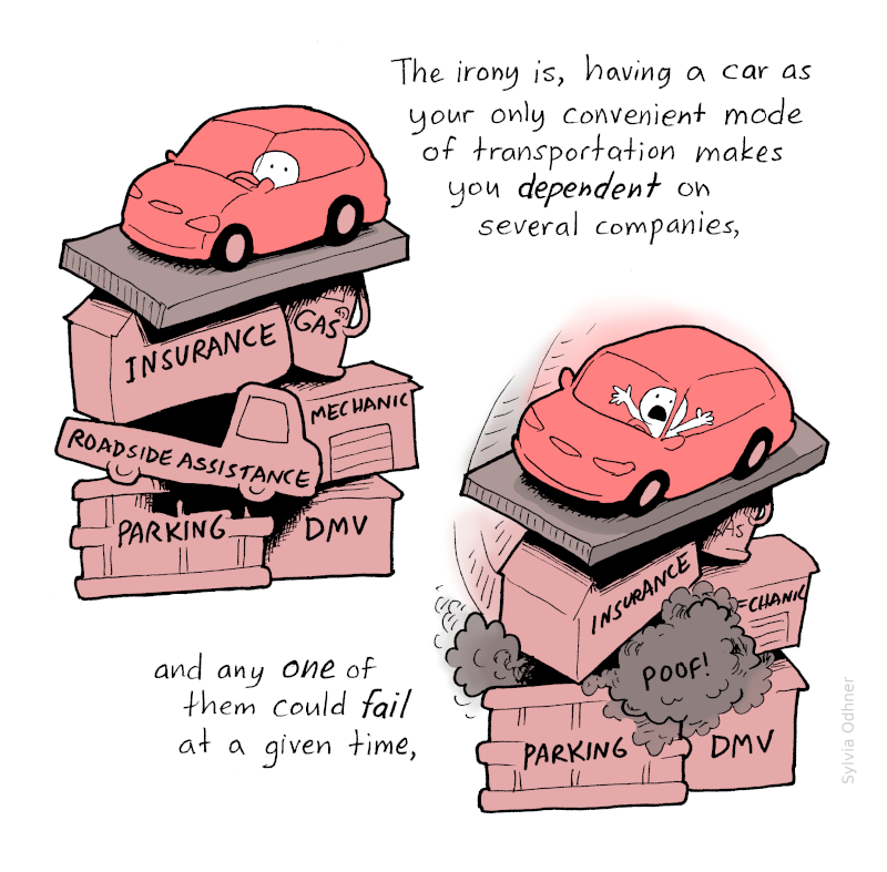 The irony is, having a car as your only convenient mode of transportation makes you dependent on several companies (insurance, gas, roadside assistance, mechanic, parking, DMV), and any one of them could fail at a given time, leaving you unable to use the car that you’ve already spent so much money on.