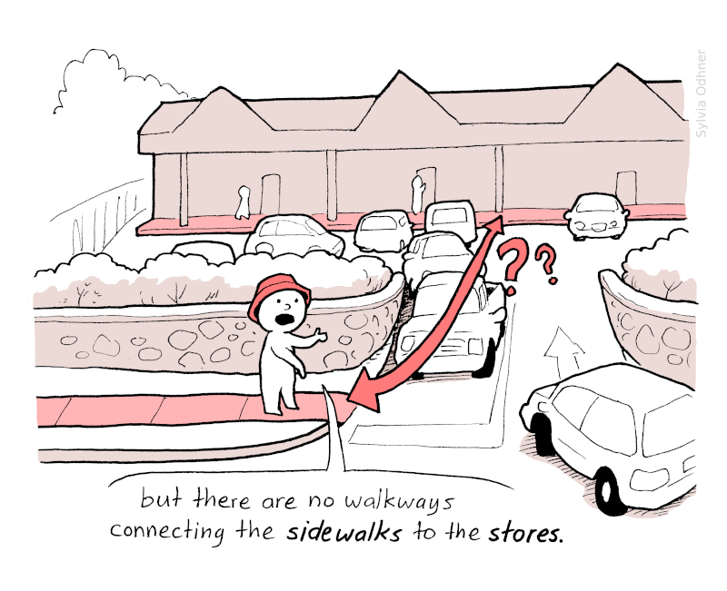 I live in a suburb. There are a few shopping centers I can easily walk to from where I live. The streets next to them have sidewalks, and there are walkways connecting the stores together... but there are no walkways connecting the sidewalks to the stores. I’m glad this street has a sidewalk, but where is it supposed to lead to? Is it just for recreation?